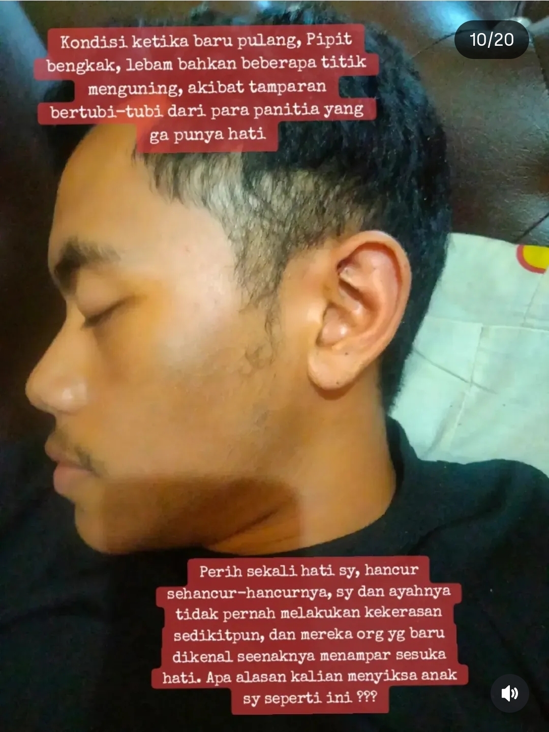 - Kekerasan Fisik di Wajah: Terdapat lebam dan bengkak pada wajah korban yang diduga akibat tamparan bertubi-tubi dari oknum panitia.